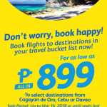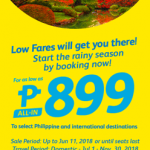 Rainy season can't stop us from traveling! Don't let rainy days be a hindrance to your travel plans. Book your flights with Cebu Pacific Air's low fares. For only 899 all-in, you can travel to any select Philippine destinations and as low as 2399 all-in to any select international flights. Cebu Pacific’s Value Alliance Sale promo ends until June 11, 2018. Travel Period … [Read more...]
